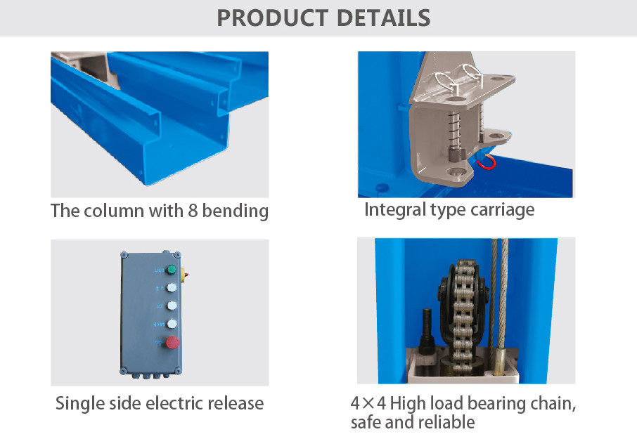 1) दो पोस्ट हाइड्रोलिक लिफ्ट में सरल ऑपरेशन, सुरक्षा और विश्वसनीयता के फायदे हैं,