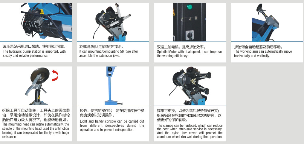 4) यह हाइड्रोलिक चालित गाड़ी से लैस है जिससे टायर बिना मैन पावर के टायर चेंजर पर चल रहा है।